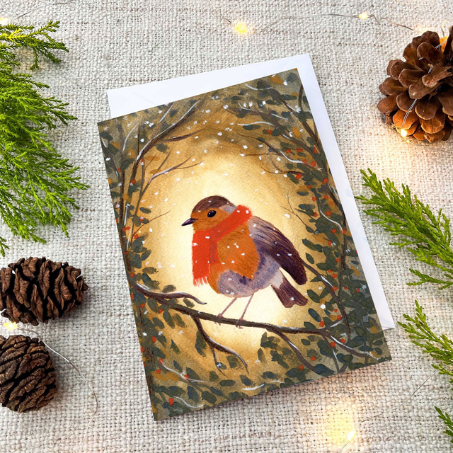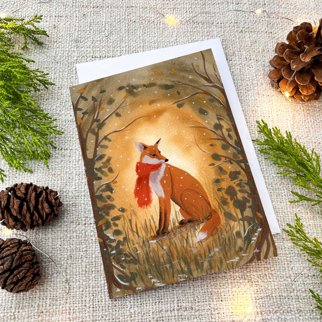 Bring a touch of rustic charm and original art to your holiday greetings with this exquisite set of three Christmas cards. Featuring beautiful hand-painted gouache artwork of beloved woodland animals (Fox, Robin, and Fawn) against a serene winter forest backdrop. These high-quality cards are designed to be framed as miniature art prints.